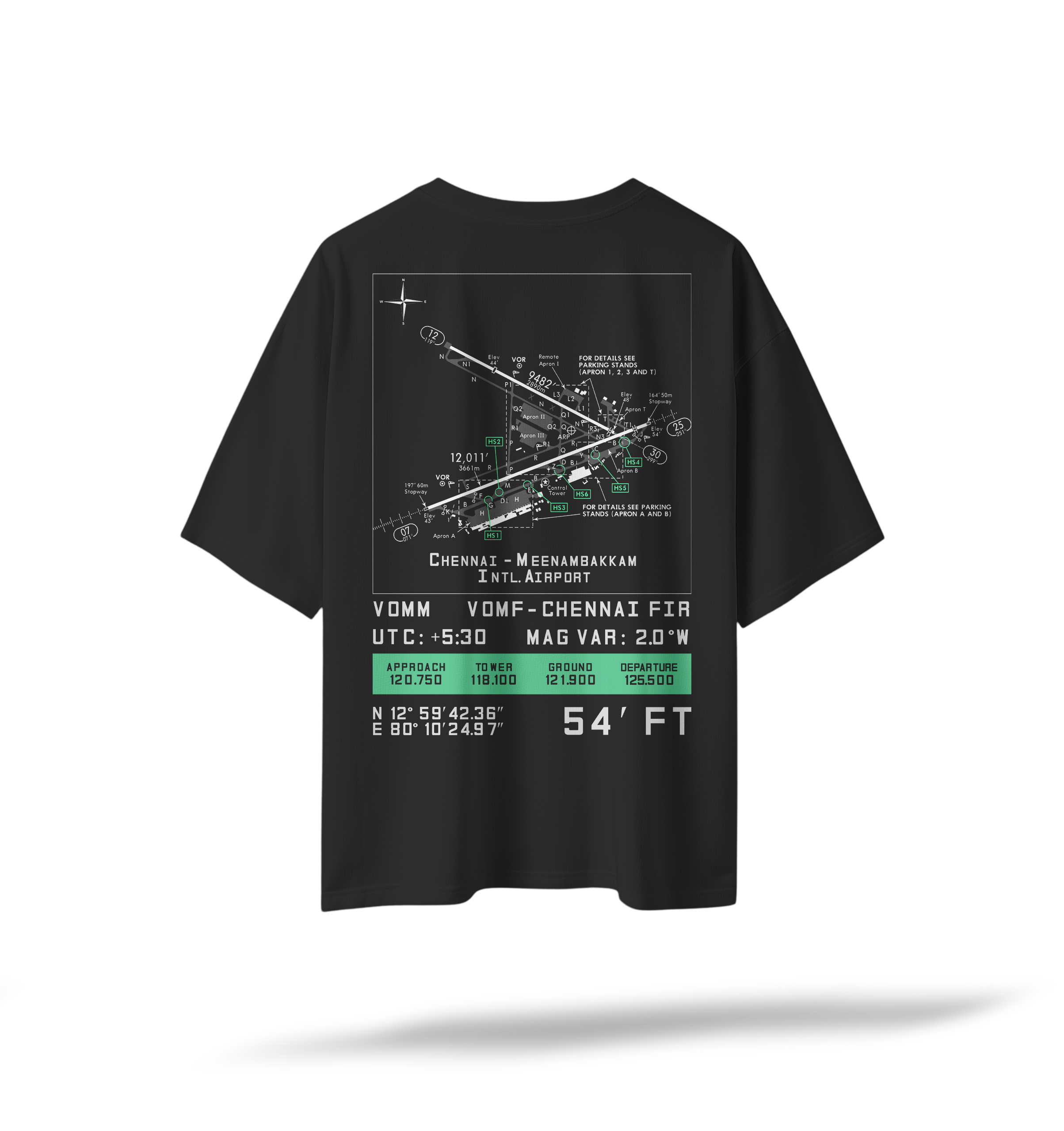A tribute to the southern gateway of Indian aviation, this tee features the runway chart of Chennai International Airport, VOMM. With authentic radar data, real-world coordinates, and a tactical aviation layout, this piece blends pilot-grade precision with streetwear impact. Cleared for takeoff, no tower approval needed.