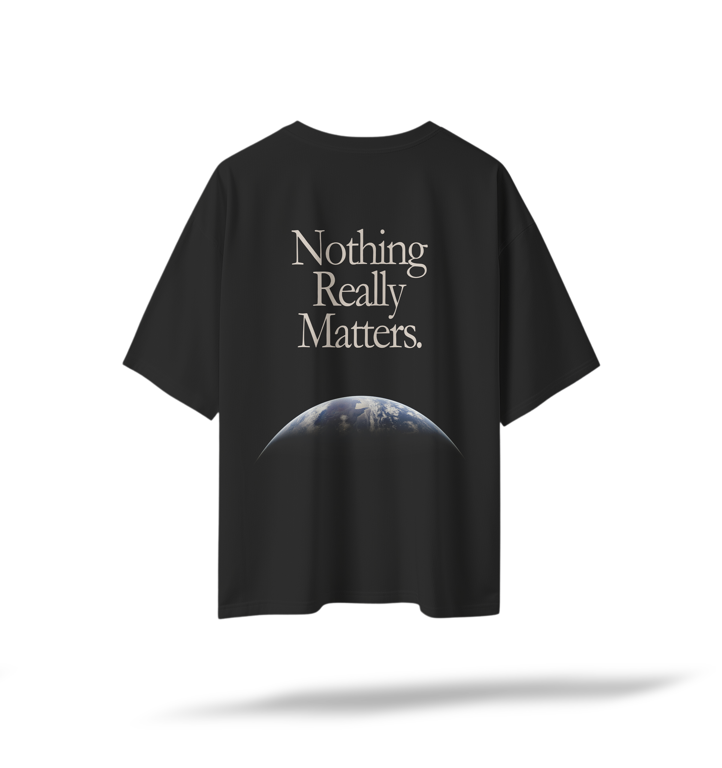 A reminder, or maybe a confession: when you zoom out far enough, it’s all dust. This oversized black tee captures the weight of insignificance with a cold, distant Earth hanging below the words that echo in every quiet moment — Nothing Really Matters.