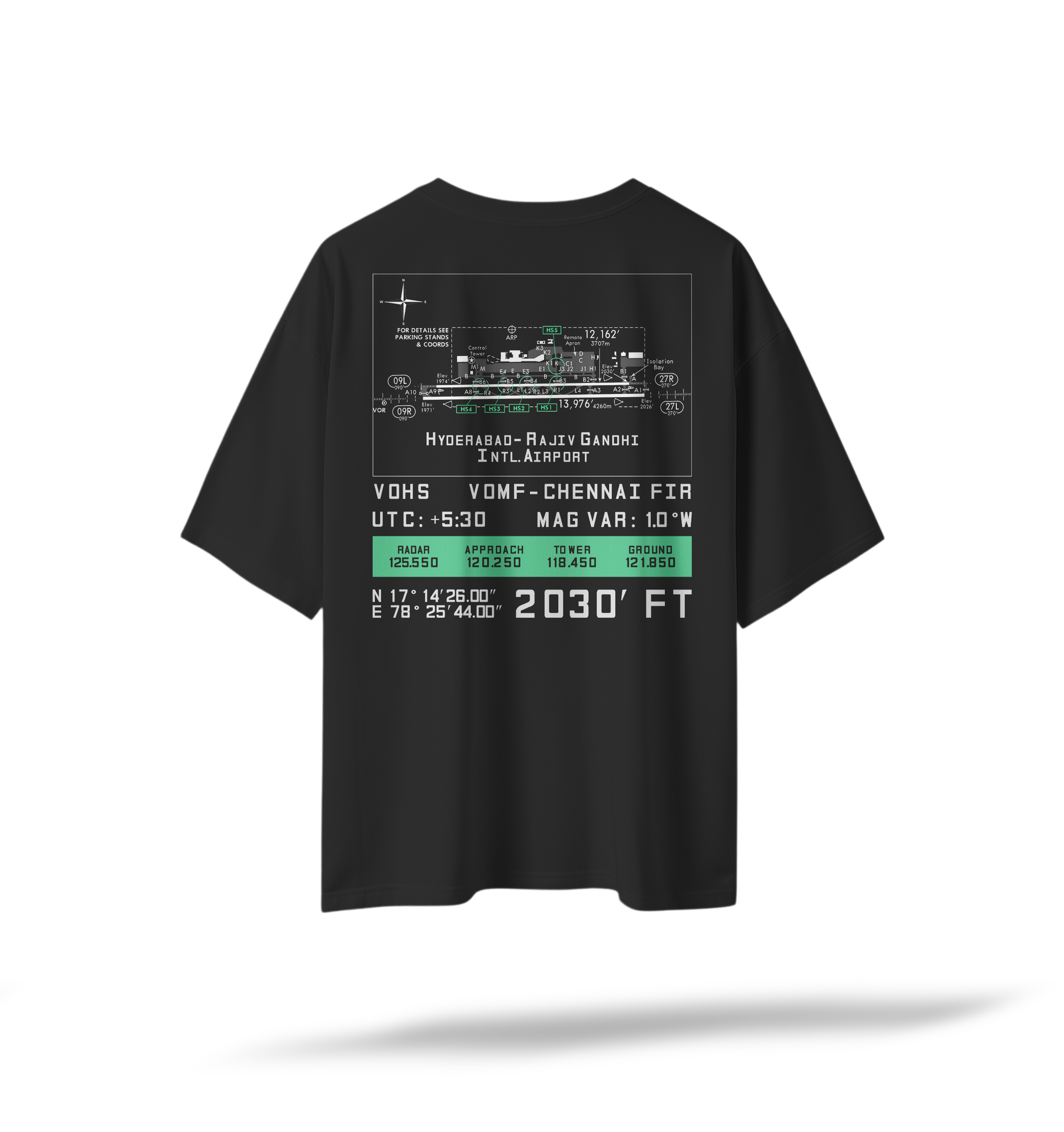 A tribute to the high-altitude hustle of Hyderabad, this tee features the runway chart of Rajiv Gandhi International Airport, VOHS. With authentic radar data, real-world coordinates, and a tactical aviation layout, this piece blends pilot-grade precision with streetwear impact. Cleared for takeoff, no tower approval needed. Designed for aviation lovers and streetwear heads alike, it features real ATC data, coordinates, and a bold radar-map layout that lands attention instantly. Clean. Technical. Flight-core approved.